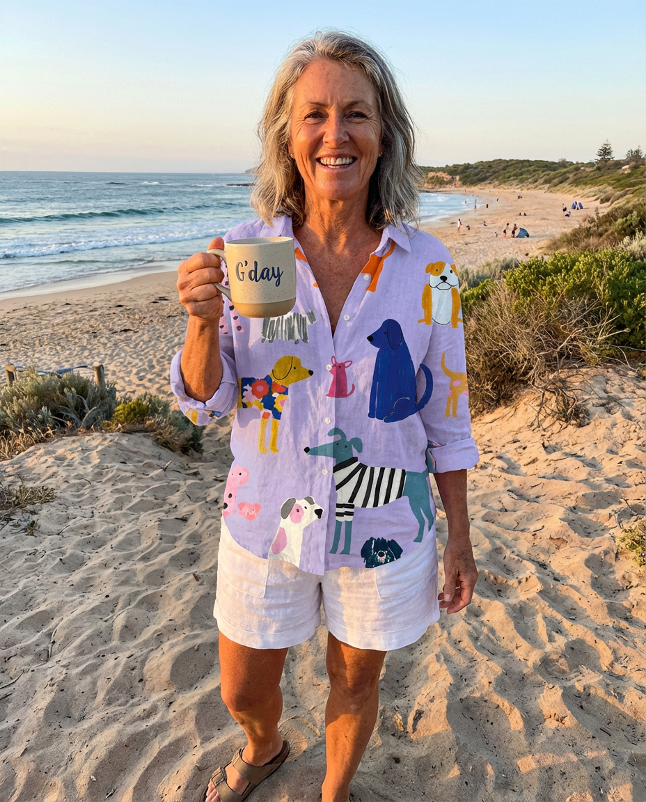 Pair the Florence Blouse for Playful Dogs with crisp white trousers or soft jeans for a fresh, playful look — perfect for brunches, casual meet-ups, or weekend outings. For a more laid-back vibe, tuck it into denim shorts or a relaxed skirt and finish with sandals or simple flats — its illustrated-dog print and easy silhouette keep the outfit fun and effortless.