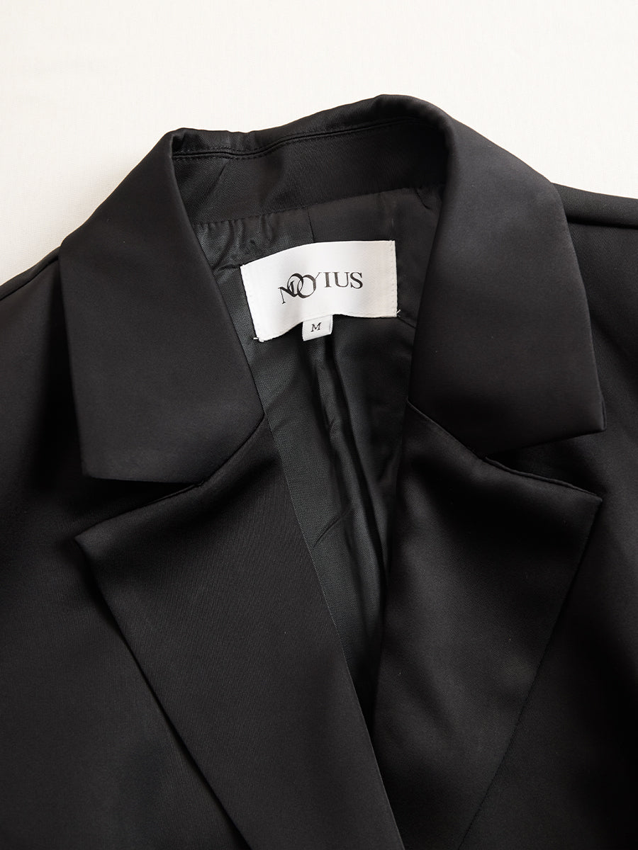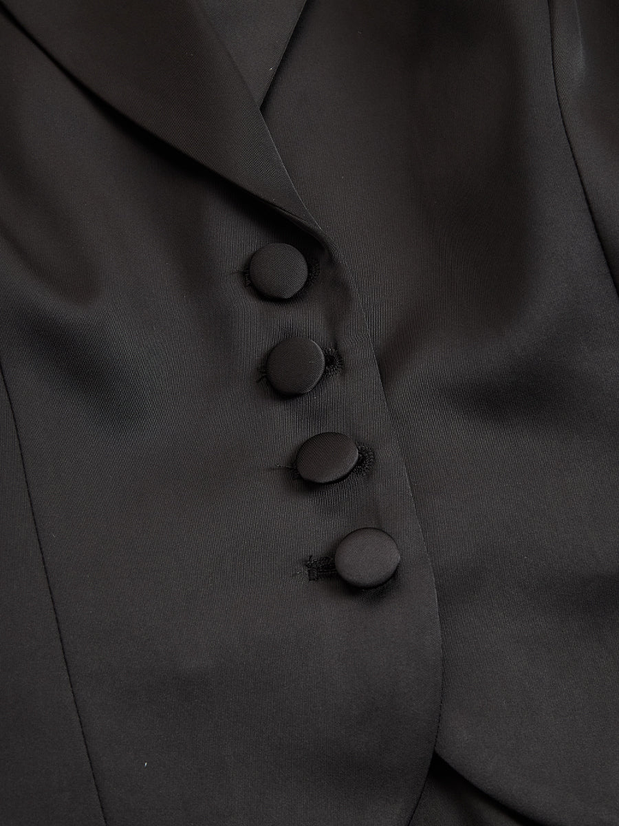 The Black Tailored Blazer Gown is a striking fusion of sharp tailoring and delicate femininity. This gown features a fitted blazer-inspired bodice with a structured lapel, sculpted waistline, and button-down closure that highlights precision craftsmanship. Flowing into a dramatic floor-length skirt, the design balances strong, architectural lines with soft, romantic details.