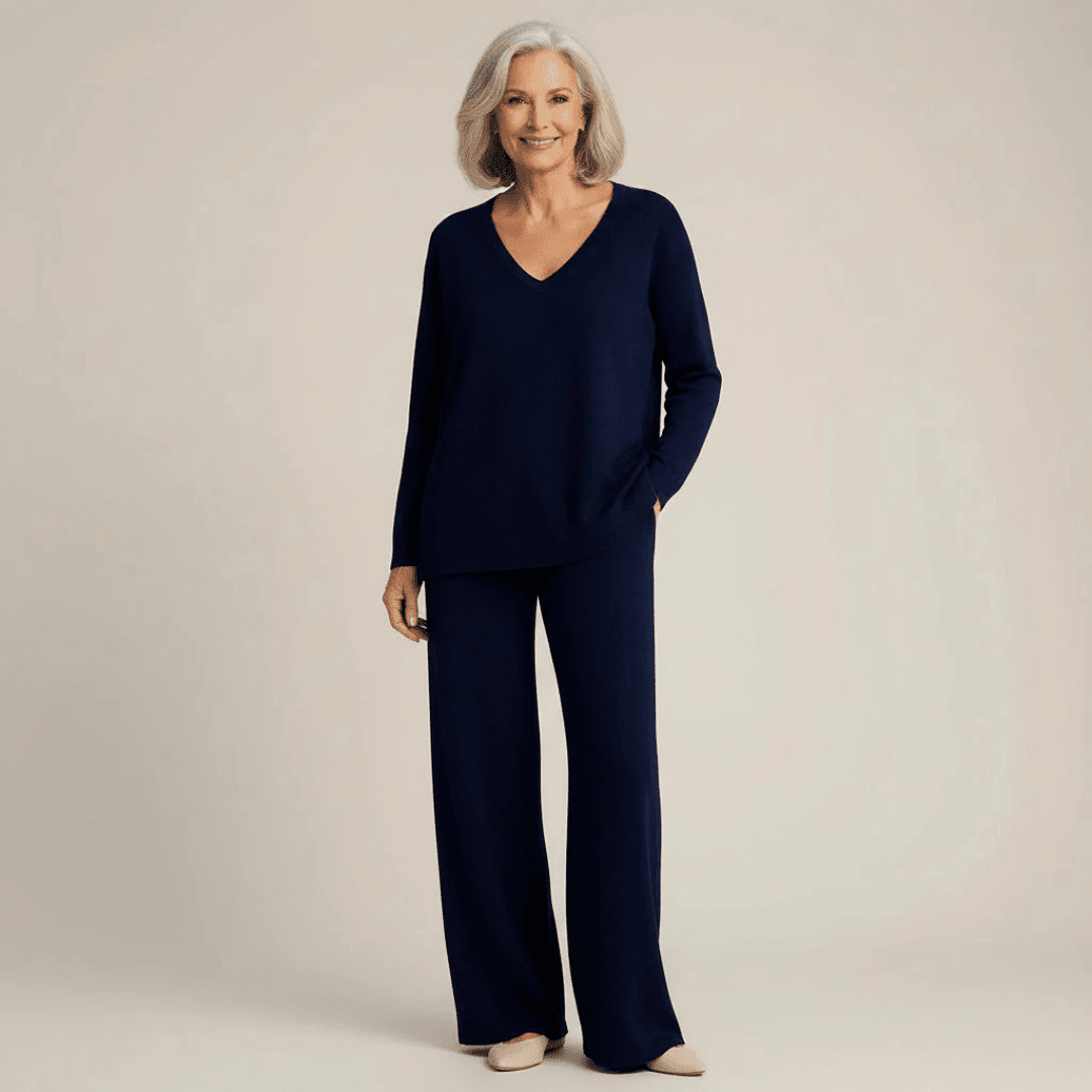 A refined and cozy 2-piece set designed for effortless elegance and everyday comfort. Featuring a soft V-neck top and coordinating pants with an elastic waistband, it offers a naturally flattering fit with a feminine touch.